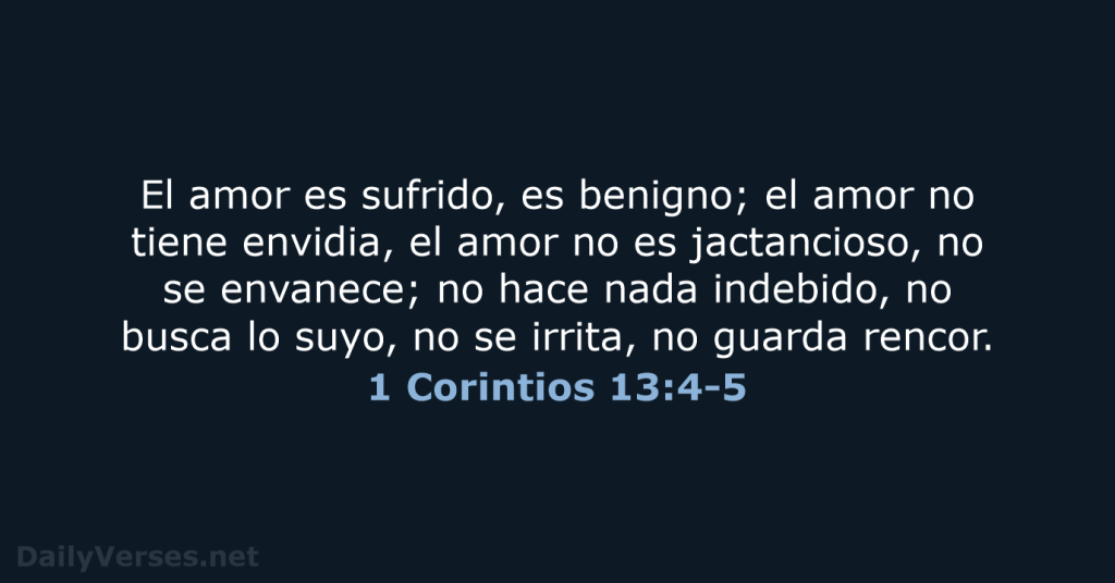 "El amor es sufrido, es benigno; el amor no tiene envidia, el amor no es jactancioso, no se envanece, no hace nada indebido, no busca lo suyo, no se irrita, no guarda rencor; no se goza de la injusticia, mas se goza de la verdad. Todo lo sufre, todo lo cree, todo lo espera, todo lo soporta. El amor nunca deja de ser."