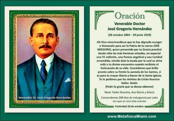 "¡Oh, Dios que inspiraste al siervo tuyo, el Doctor José Gregorio Hernández, para que dedicara su vida al servicio de los enfermos, dale la gracia que necesito (mencione aquí el favor que se pide) y concédeme por su intercesión, si es tu voluntad, la salud del cuerpo y del alma! Amén".